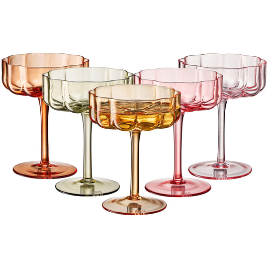 Khen Flower Vintage Wavy Glass Coupes Martini, Champagne & Cocktail Coupes - Set of 6-7oz Colorful Cocktail Glasses & Champagne, Prosecco, Mimosa Glassware Copyright Design - Fall Holiday Colors