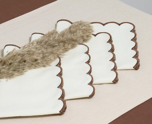 PurpleEssences Scalloped Embroidery Cloth Napkins Table Decor Fall Thanksgiving 100% Cotton Set of 4-18 x 18 inch - Beige - Edges - Brown