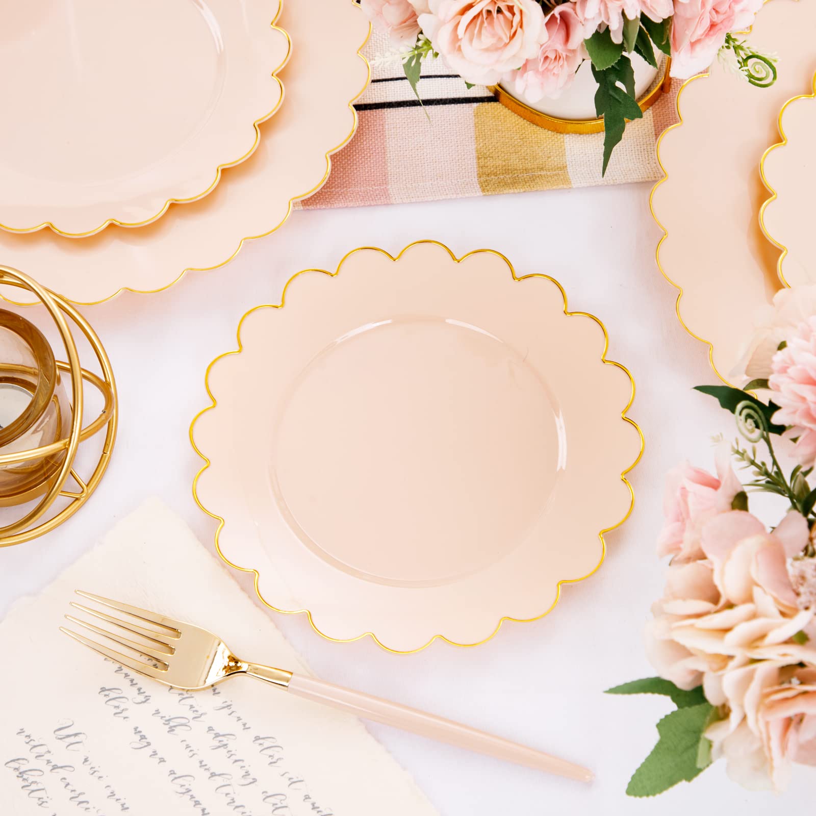 RECYCLABLE OR REUSABLE: Flexible Choice- you could save clean up time by throwing away these disposable pink gold plastic plates after your party, or reuse these gold rim plates by hand wash.