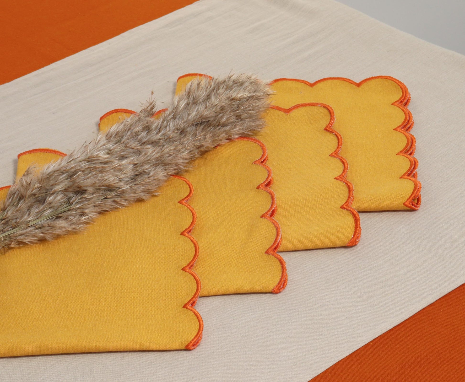 PurpleEssences Scalloped Embroidery Cloth Napkins Table Decor Fall Thanksgiving 100% Cotton Set of 4-18 x 18 inch - Golden Yellow - Edges - Orange