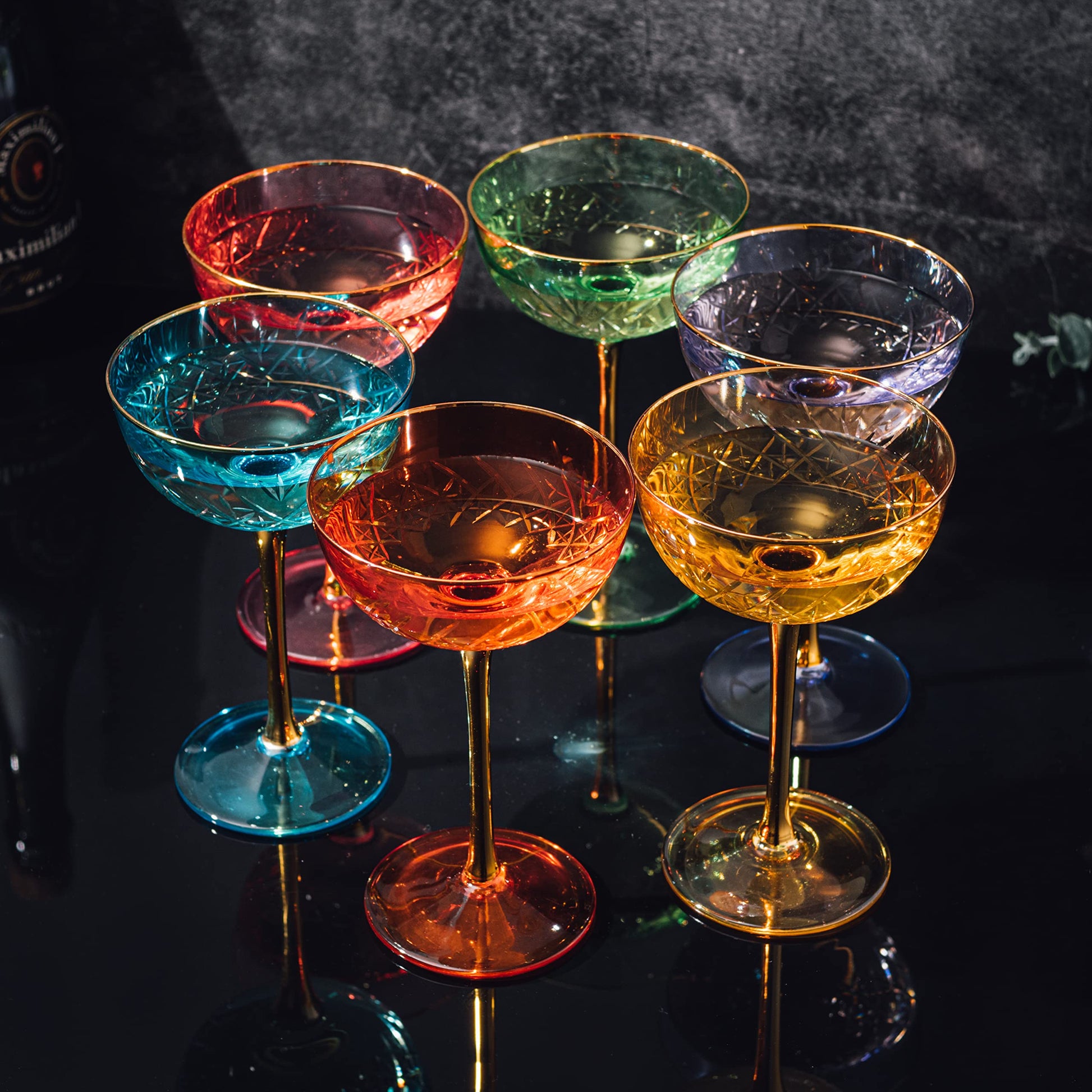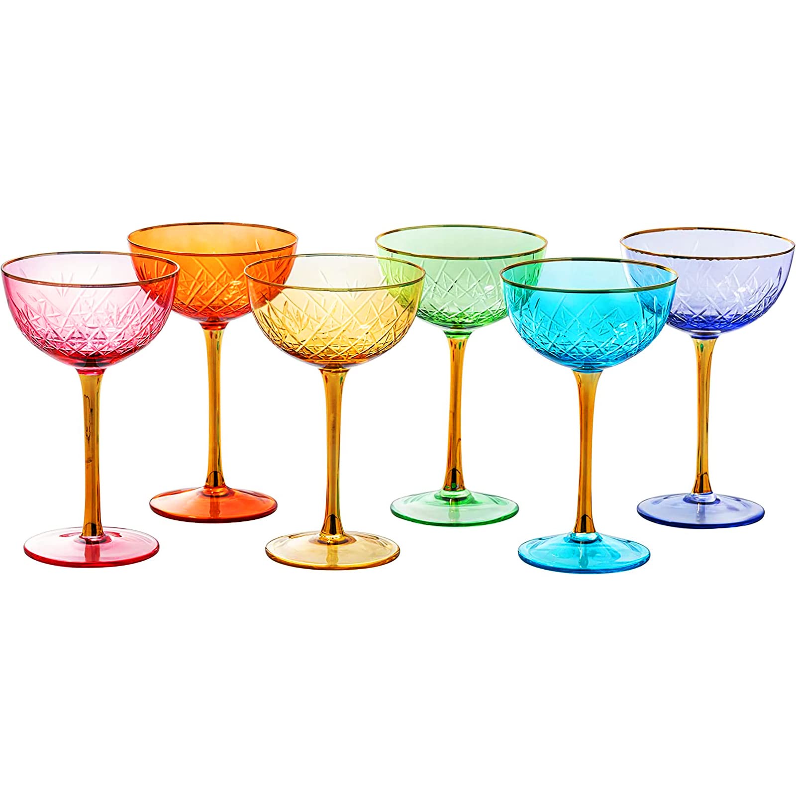Playing up the charming qualities of handblown glass, our elegant coupe glasses are mouth-blown to create unique hues. They’re finished with gold plating that lends a colorful and elegant touch to your favorite holiday beverages. Whether shopping for a wedding gift, hosting a dinner party or building your own barware collection, this elegant set of six Coupe Colored Glasses will make any occasion extra celebratory.